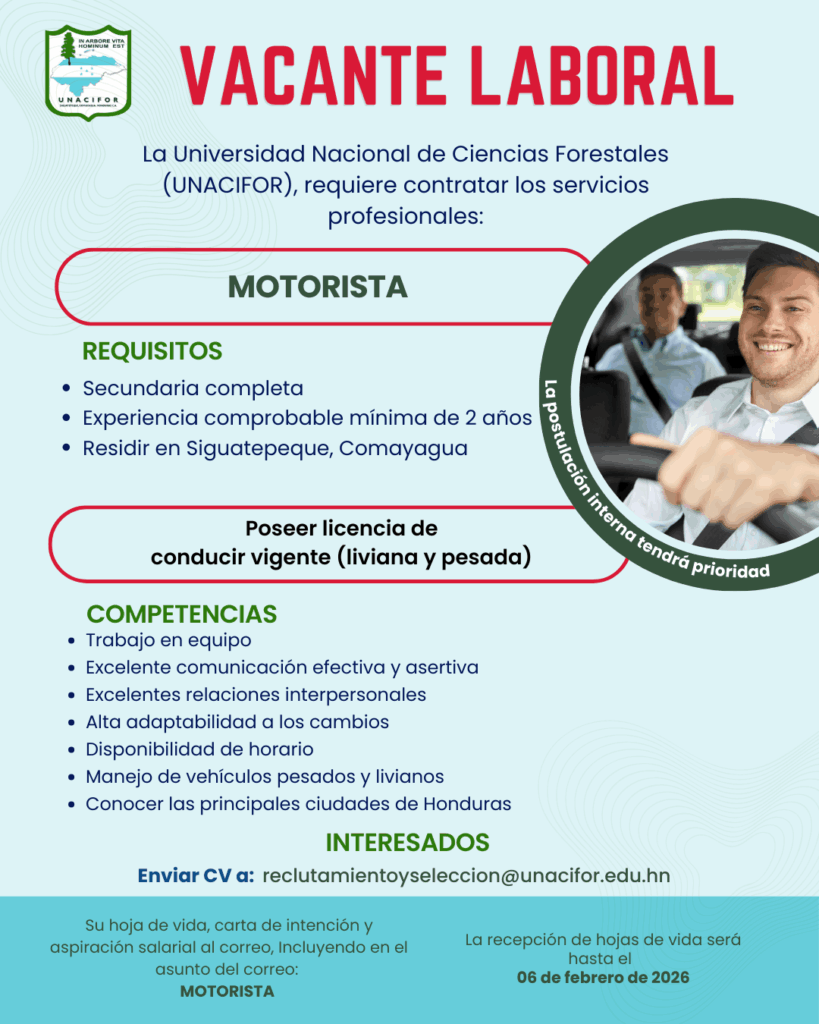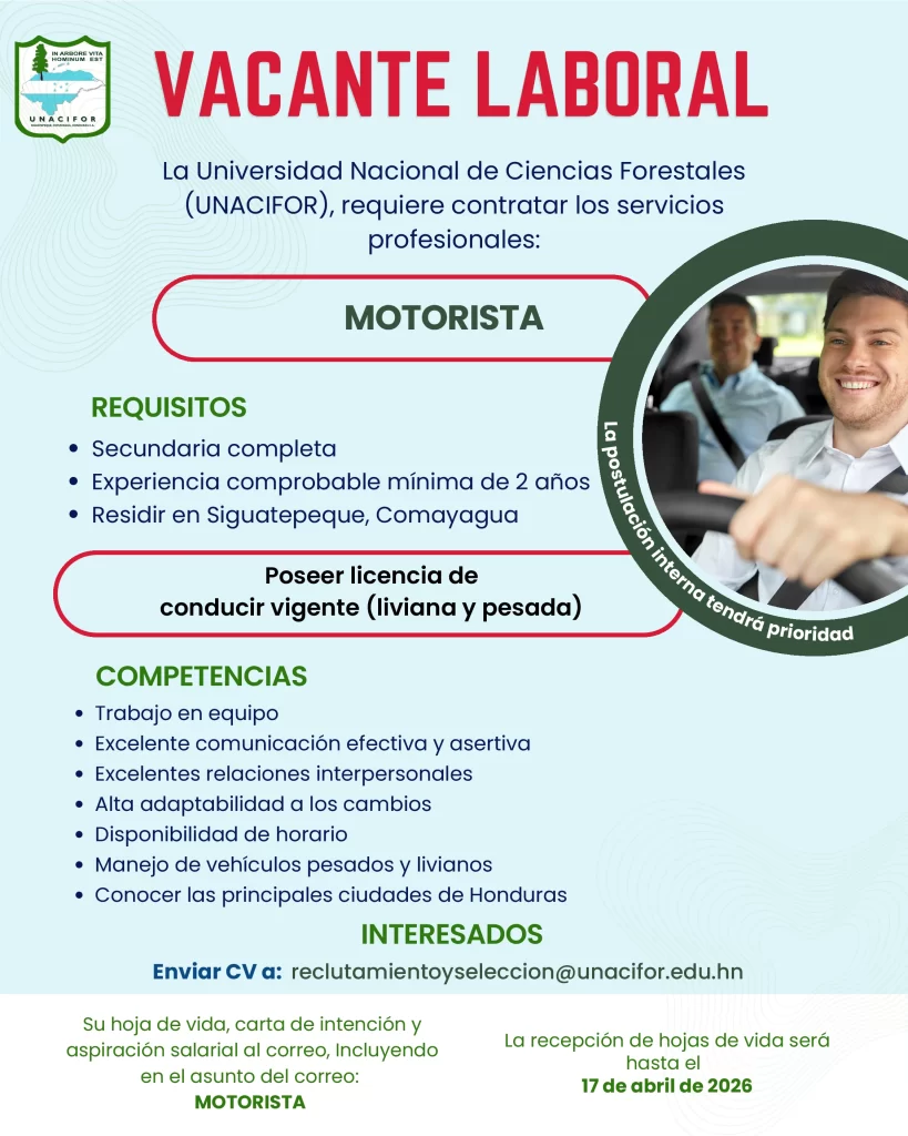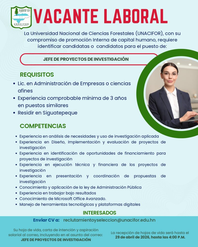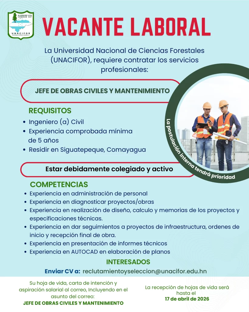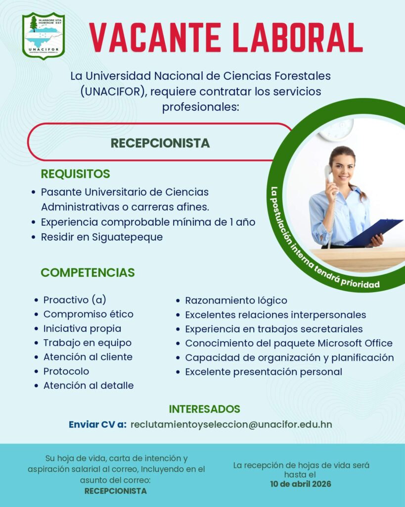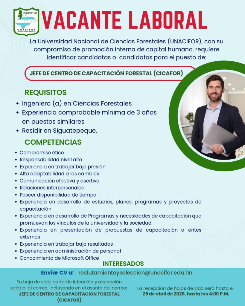 Estefany Bonilla 20 de junio de 2025 a las 9:46 PM Buenas Tardes puede enviar su hoja de vida al correo de recursos humanos Ya que son ellos los que reciben las hojas de vida, reclutamientoyseleccion@unacifor.edu.hn Responder