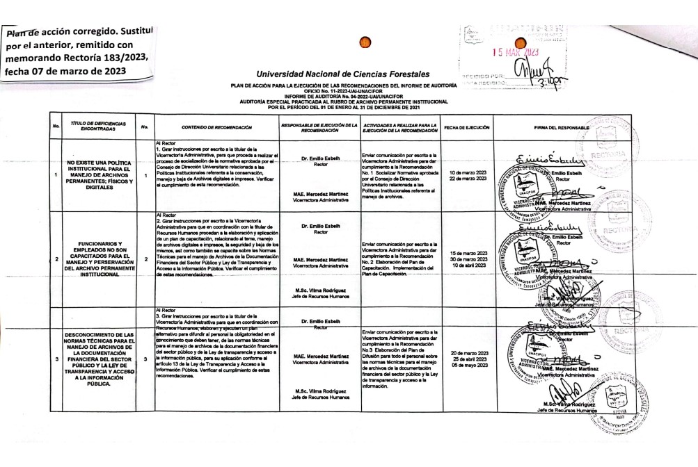 Plan de acción auditoría especial practicada al rubro archivo permanente institucional de la Unacifor